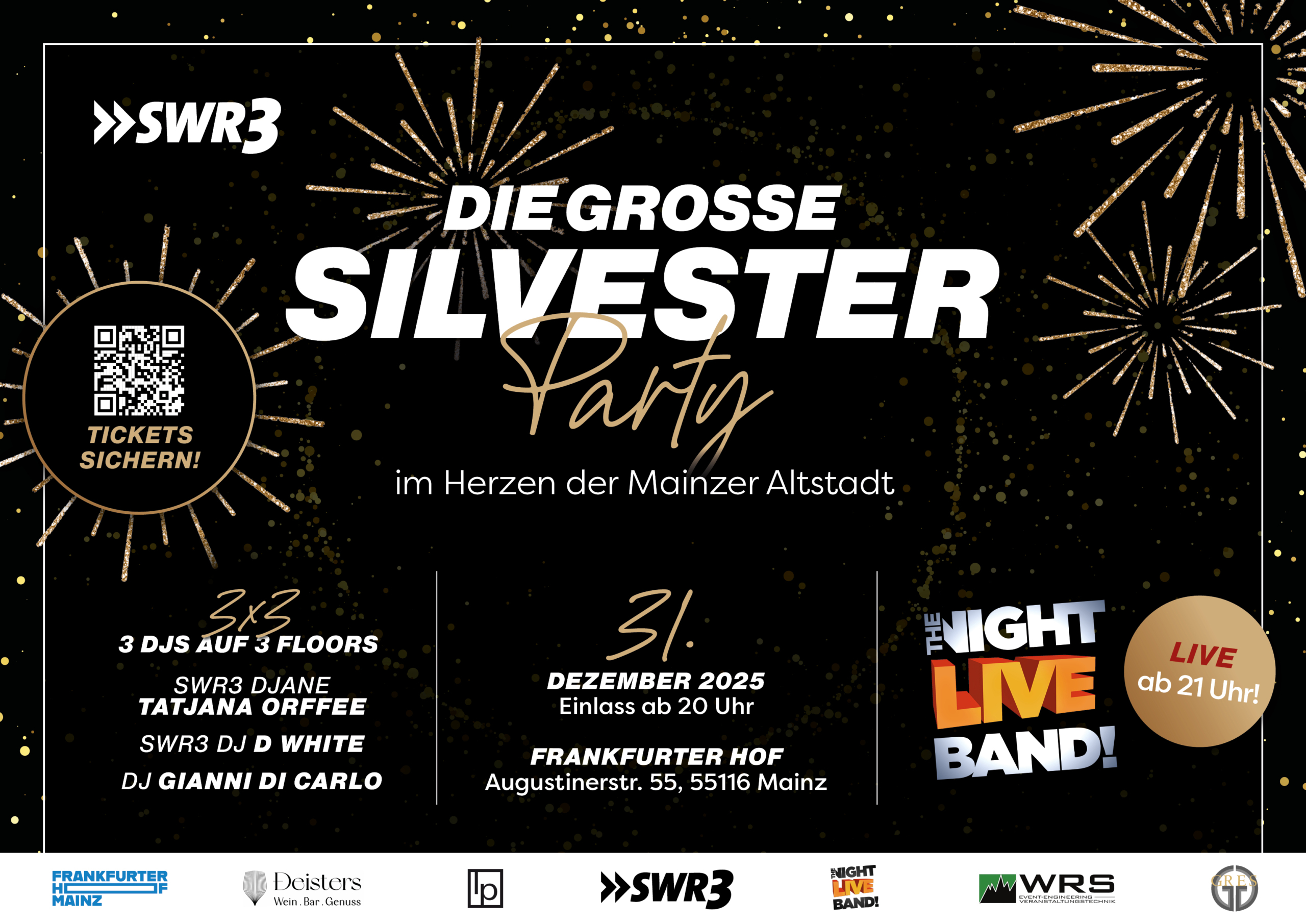 Mainz feiert stilvoll ins neue Jahr: Am 31. Dezember 2025 verwandelt sich der traditionsreiche Frankfurter Hof Mainz in die wohl spektakulärste Partylocation der Region. Bei der großen Silvesterparty 2025, präsentiert von SWR3, erwartet die Gäste ein außergewöhnliches Programm aus Live-Musik, Top-DJs, Entertainment und zahlreichen Highlights – ein unvergesslicher Jahreswechsel ist garantiert.